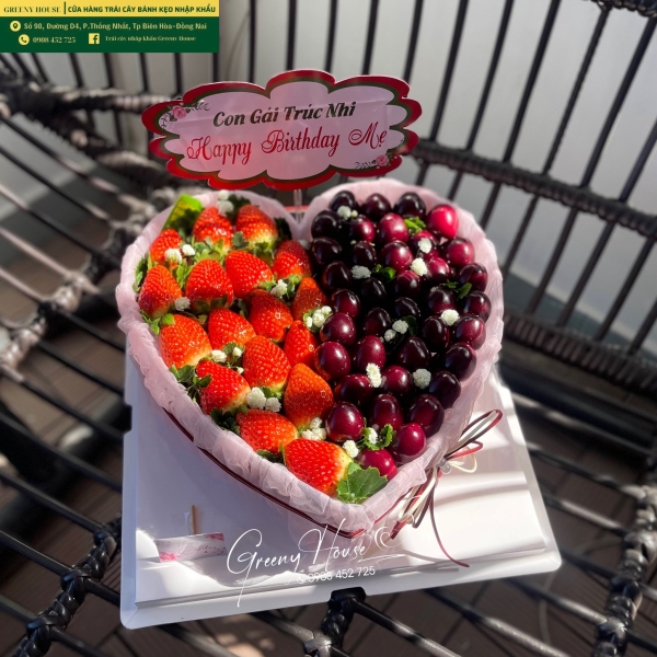 Chiếc bánh được tạo hình trái tim lãng mạn, với sự kết hợp dâu tây tươi chua nhẹ và cherry mọng ngọt. Không chỉ ngon mà còn mang ý nghĩa tình cảm sâu sắc, rất phù hợp để tặng người yêu, bạn bè hoặc người thân.